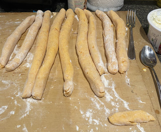 Once the dough is the correct consistency, transfer it to a clean floured work surface and form it into a loaf, about 9×5 inches. Cut a slice off of the loaf on the short side and roll and stretch the slice on a floured surface until it forms a long, skinny rope-like shape. Cut the rope into 1-inch nuggets and transfer to a bowl.